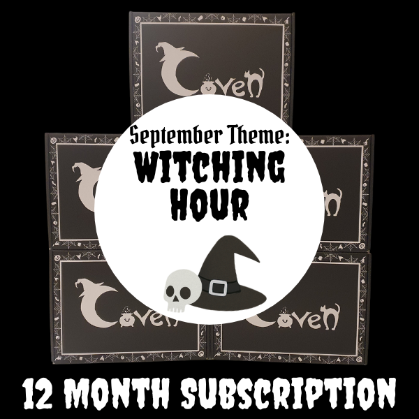 Unlock a year of spooky joy! Our 12-month subscription is packed with bewitching treasures and spellbinding delights. Each month brings a new dose of spooky joy, perfect for keeping your gothic spirit alive all year long.