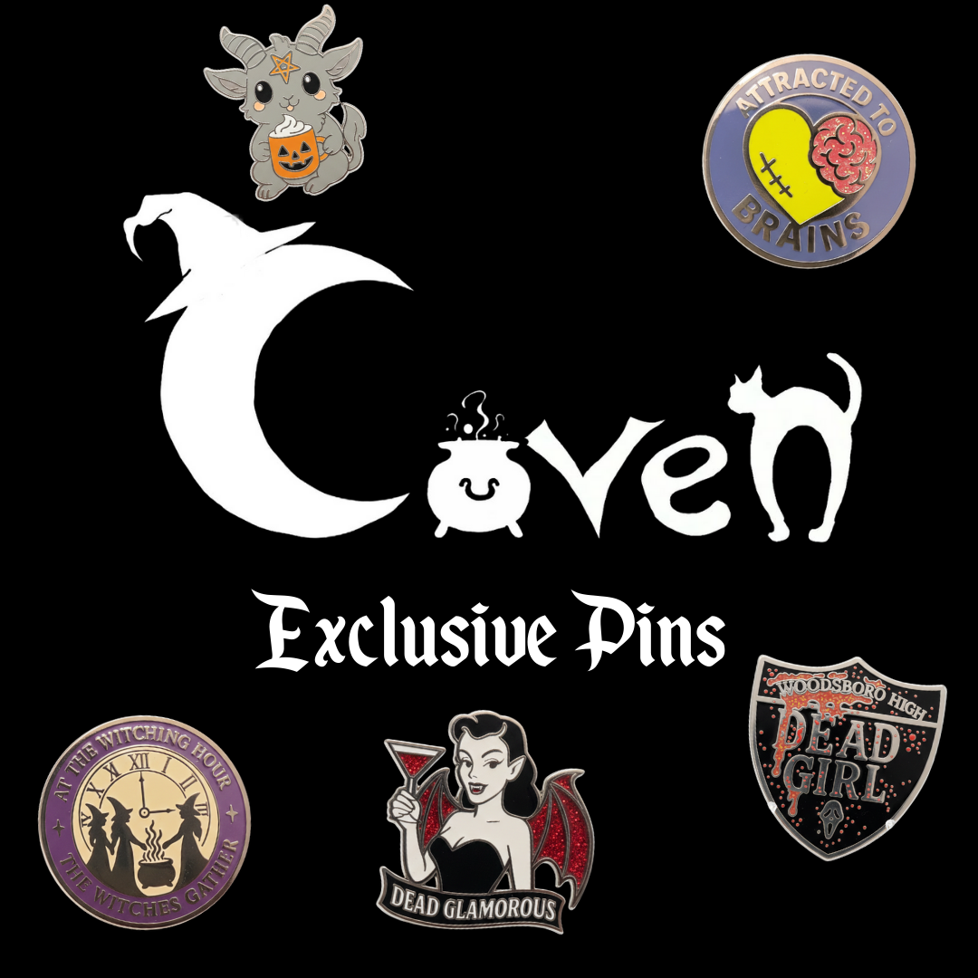 A curated collection of Coven enamel pins inspired by gothic humour, horror culture, and Halloween energy. Designed to be worn, collected, and displayed all year round.