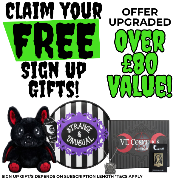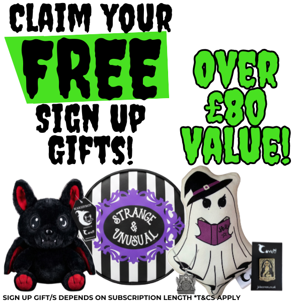 Items vary each month but typically include spooky homeware, jewellery, fashion accessories, beauty & self-care, books or stationery, and exclusive collectibles.